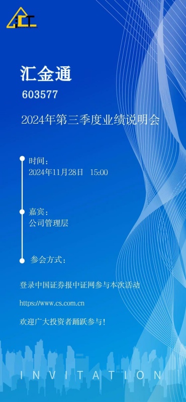 匯金通將于2024年10月28日15:00-17:00參加2024年青島轄區(qū)上市公司投資者網(wǎng)上集體接待日活動暨匯金通2024年第三季度業(yè)績說明會,