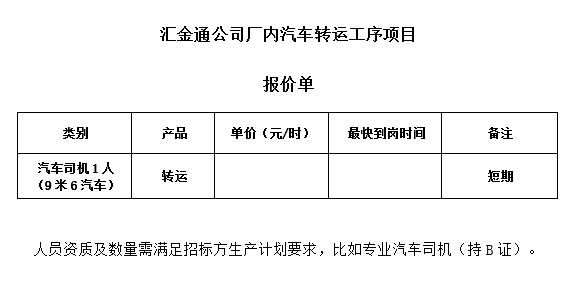 匯金通公司廠內汽車轉運工序項目公開招標公告